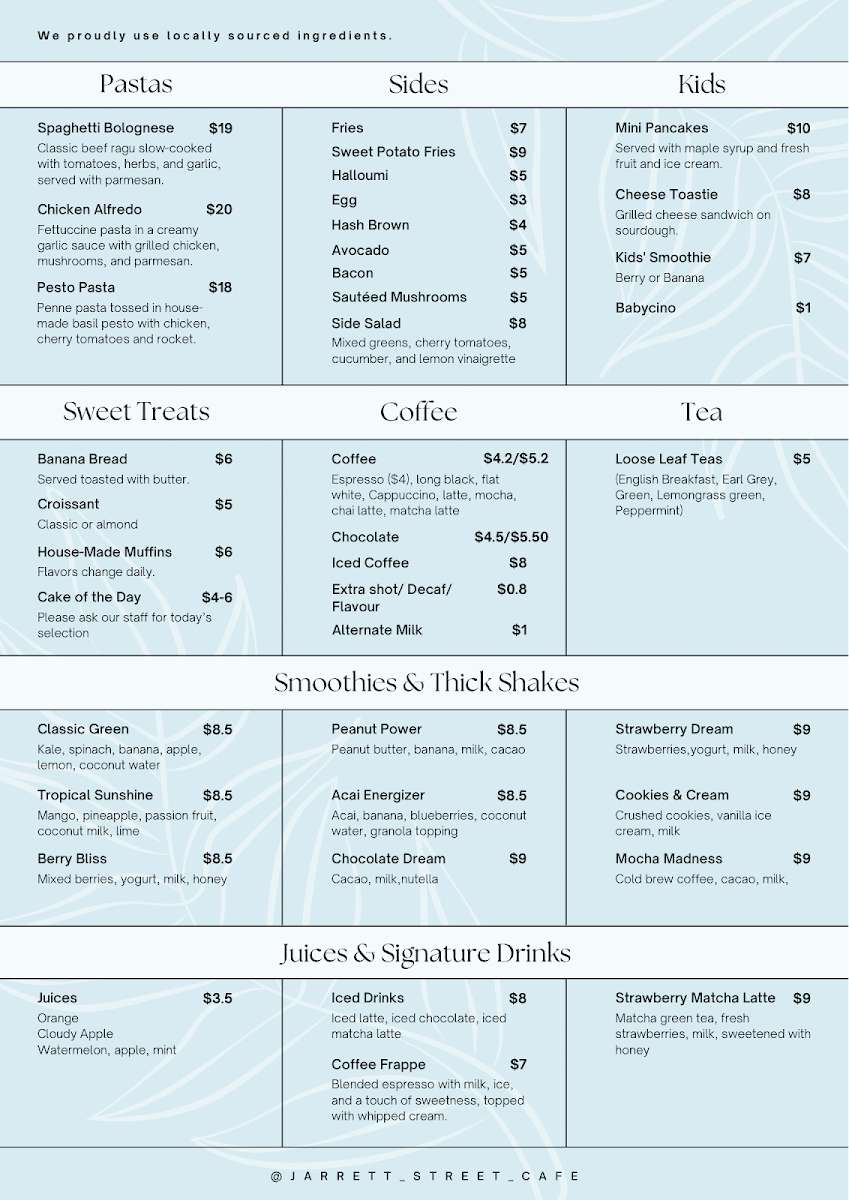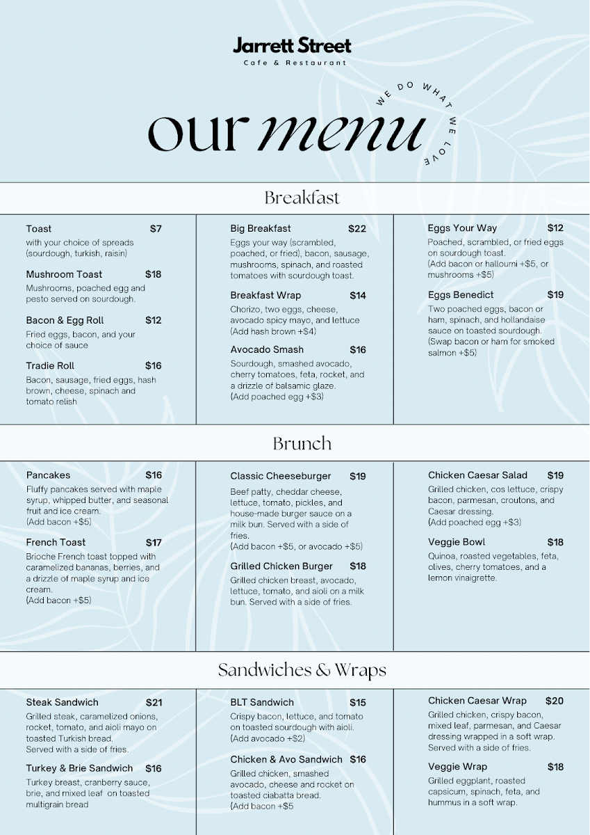 Welcome to Jarrett Street Cafe, a delightful café nestled in the heart of Leichhardt, NSW. Known for its warm atmosphere and excellent service, this spot is a haven for brunch enthusiasts. The menu offers an enticing selection crafted to satisfy diverse palates.